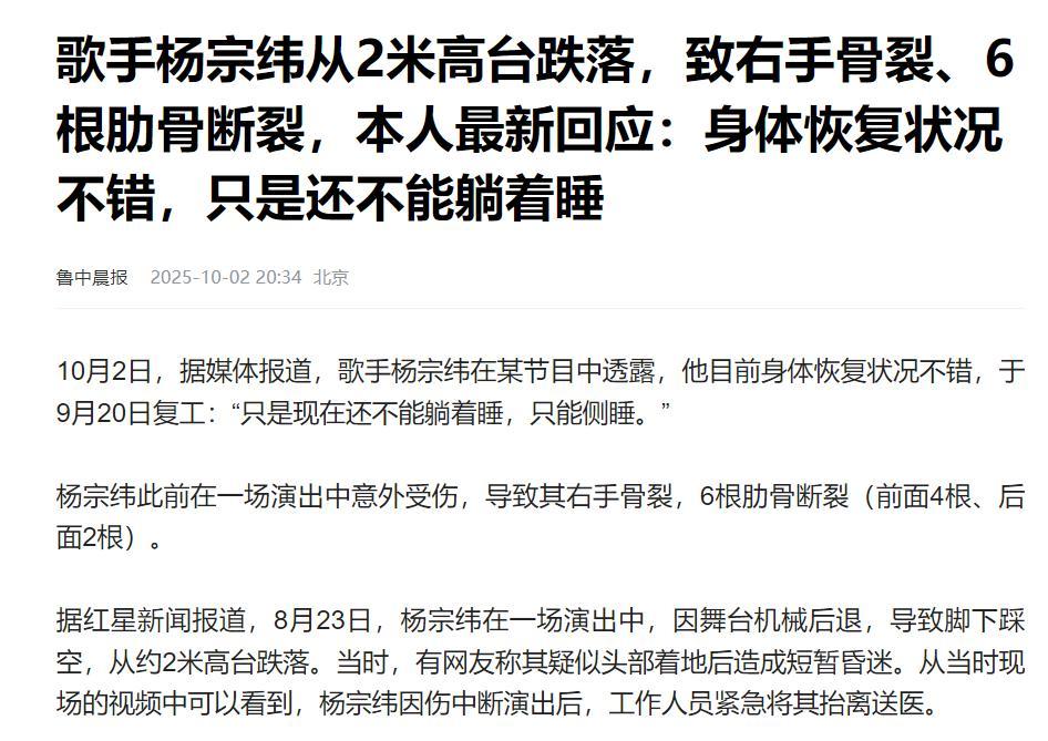 經過醫生檢查,這次跌落舞臺導致楊宗緯右手骨裂,6根肋骨斷裂。