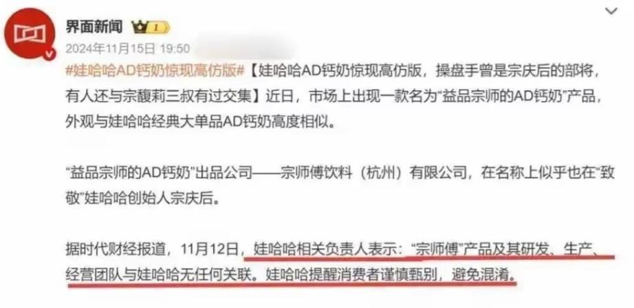 在更早之前,他還推出了高仿版的娃哈哈AD鈣奶碰瓷娃哈哈。