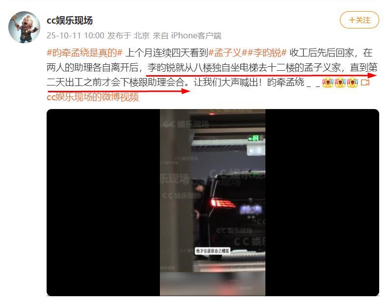 狗仔說在上個月,他看到孟子義和李昀銳收工後先後回家,在兩人的助理各自離開後,李昀銳會從8樓獨自坐電梯去12樓的孟子義家,到了第二天早上,李昀銳才從孟子義家離開,然後再下樓和助理會合。