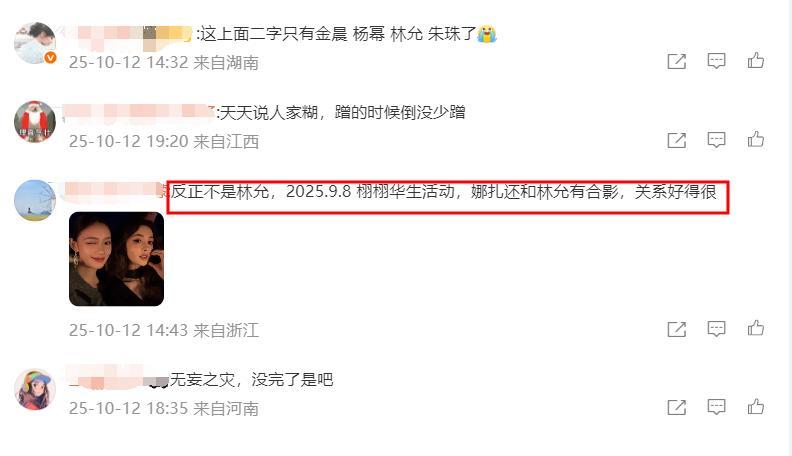 除了站姐,還有粉絲髮聲說娜扎和林允不可能有矛盾,因爲今年9月2人蔘加某活動時還一起合影了,兩人關係很好。該網友還特意曬出了娜扎和林允的合影照片。