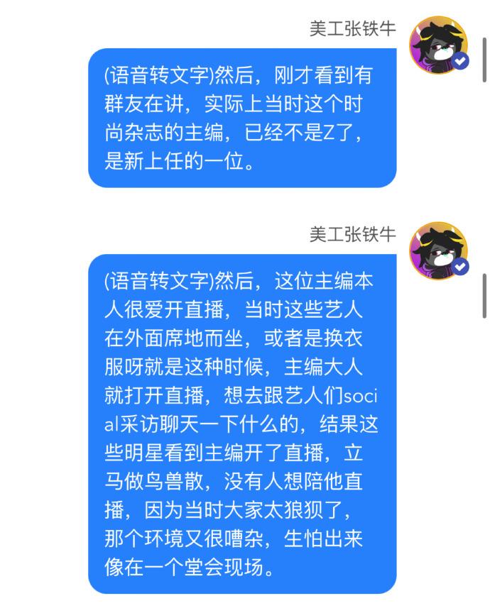 爆料者稱該主編喜歡直播,活動當天在藝人們席地而坐或者在換衣服的時候,他開了直播,想和藝人們聊一聊,但藝人們見到他都走開了,沒有人願意和他一起直播。