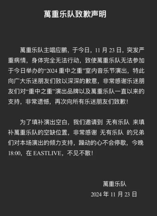 2024年11月,他離開了萬重樂隊,當時萬重樂隊發佈的聲明中寫道應鵬因爲疾病,身體已經完全無法行動。
