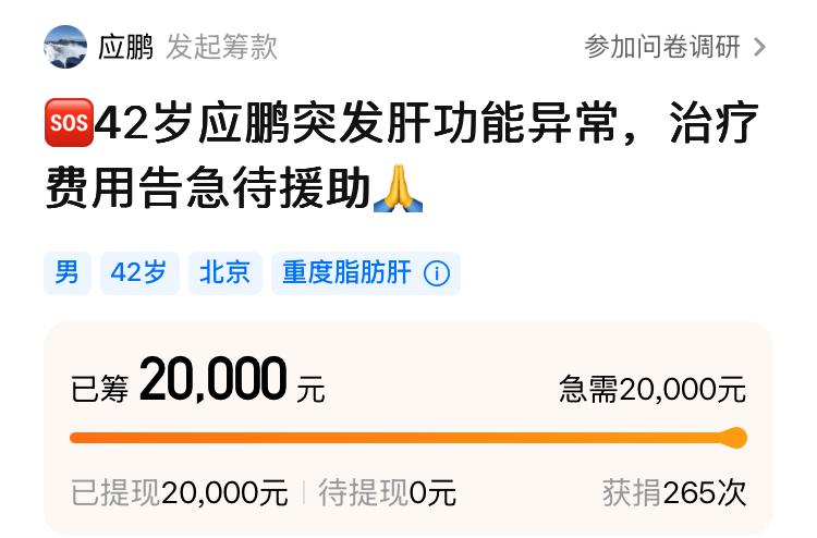 離開樂隊後,爲了治病,應鵬還曾在網絡上籌款2萬元。
