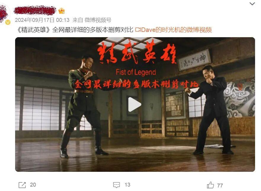 花高價從國外跳蚤市場買到這塊LD碟片的這位網友,還據此錄製了一個“《精武英雄》多版本刪減對比”,詳細解析了碟片中增加的片段。