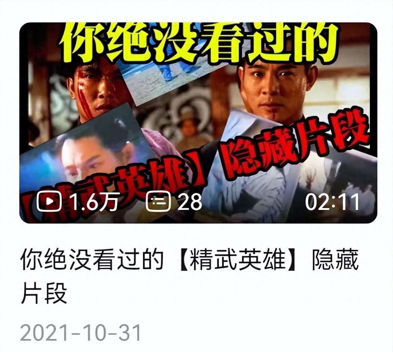 2021年10月底,網上突然出現一段2分多鐘的短視頻,標題叫《你絕沒看過的【精武英雄】隱藏片段》,內容是1994年李連杰主演電影《精武英雄》的3個從未被內地影迷發現的刪節片段。