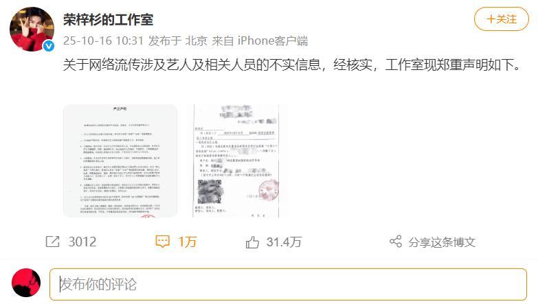 面對輿論熱議,10月16日上午,榮梓杉方面發佈了一份聲明。