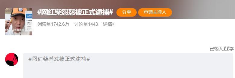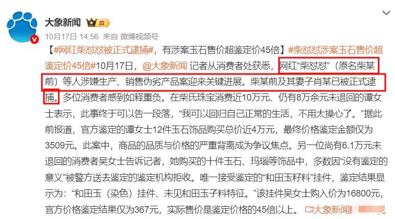 如今柴懟懟徹底栽了,10月17日,柴懟懟被正式逮捕的消息登上了熱搜。