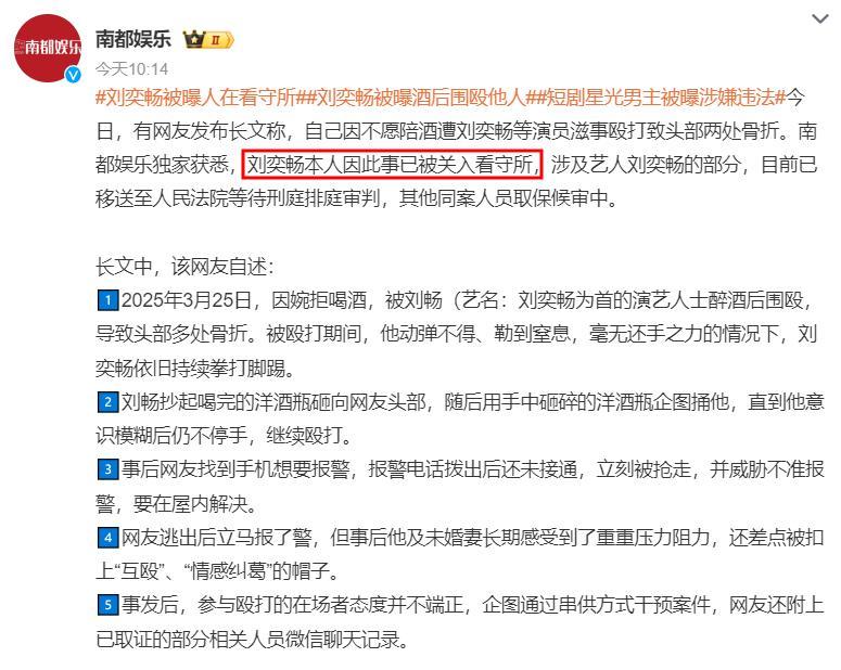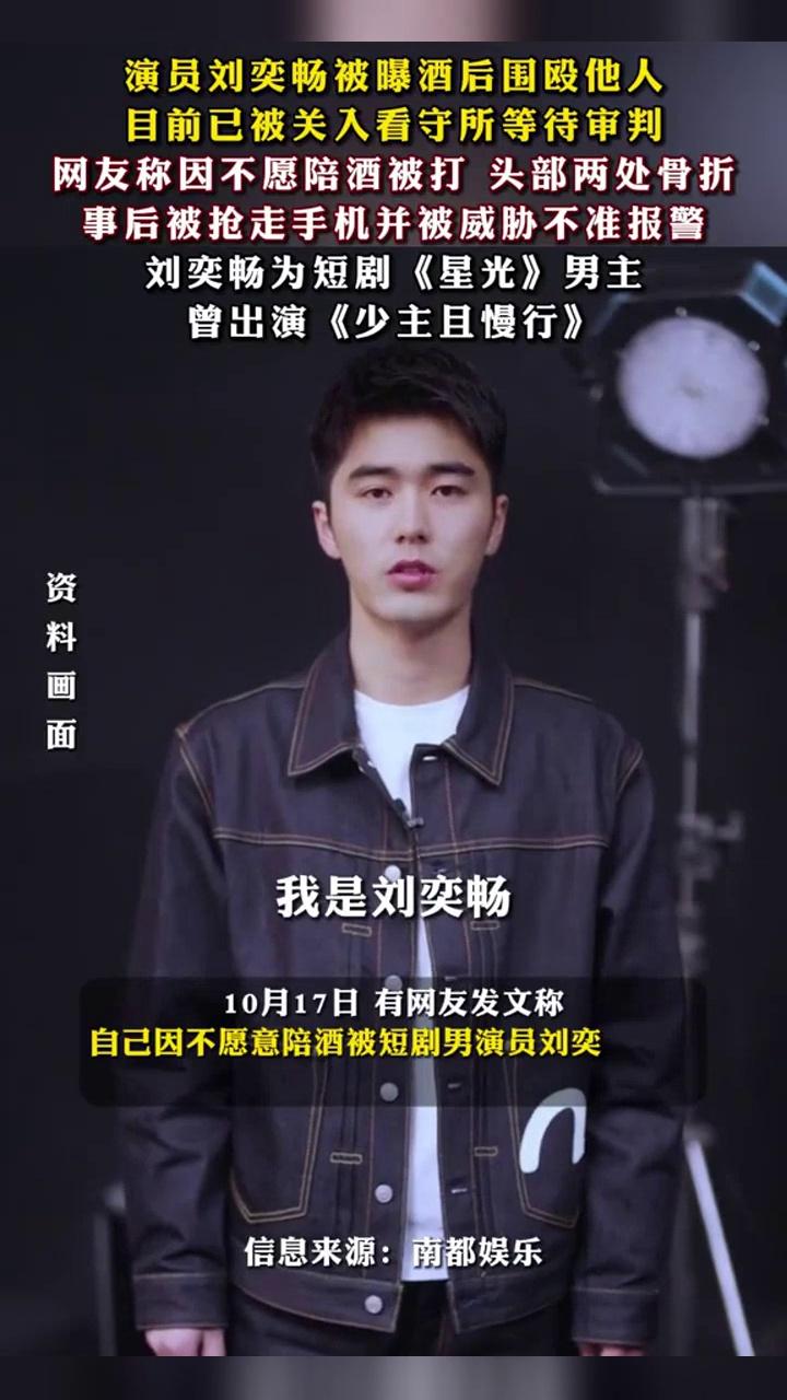 該網友說今年3月25日,因爲婉拒喝酒,劉奕暢和其他幾名演員就圍毆他,導致他的頭部多處骨折。