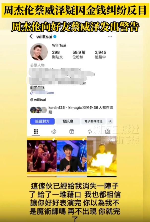 周杰倫發文稱蔡威澤“這傢伙已經消失一陣子了,找了一堆藉口,我也都相信了,還讓你好好完成表演” 。