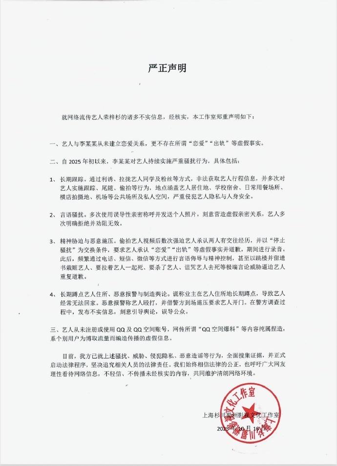 李禹熹的控訴將榮梓杉推向了輿論的風口浪尖。