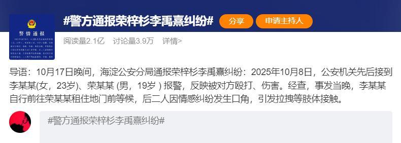 根據警方通報可知,榮梓杉和李禹熹是因爲情感糾紛發生口角,引發拉拽等肢體接觸。經過傷情鑑定,兩人均不構成輕微傷,案件正在進一步調查處理中。