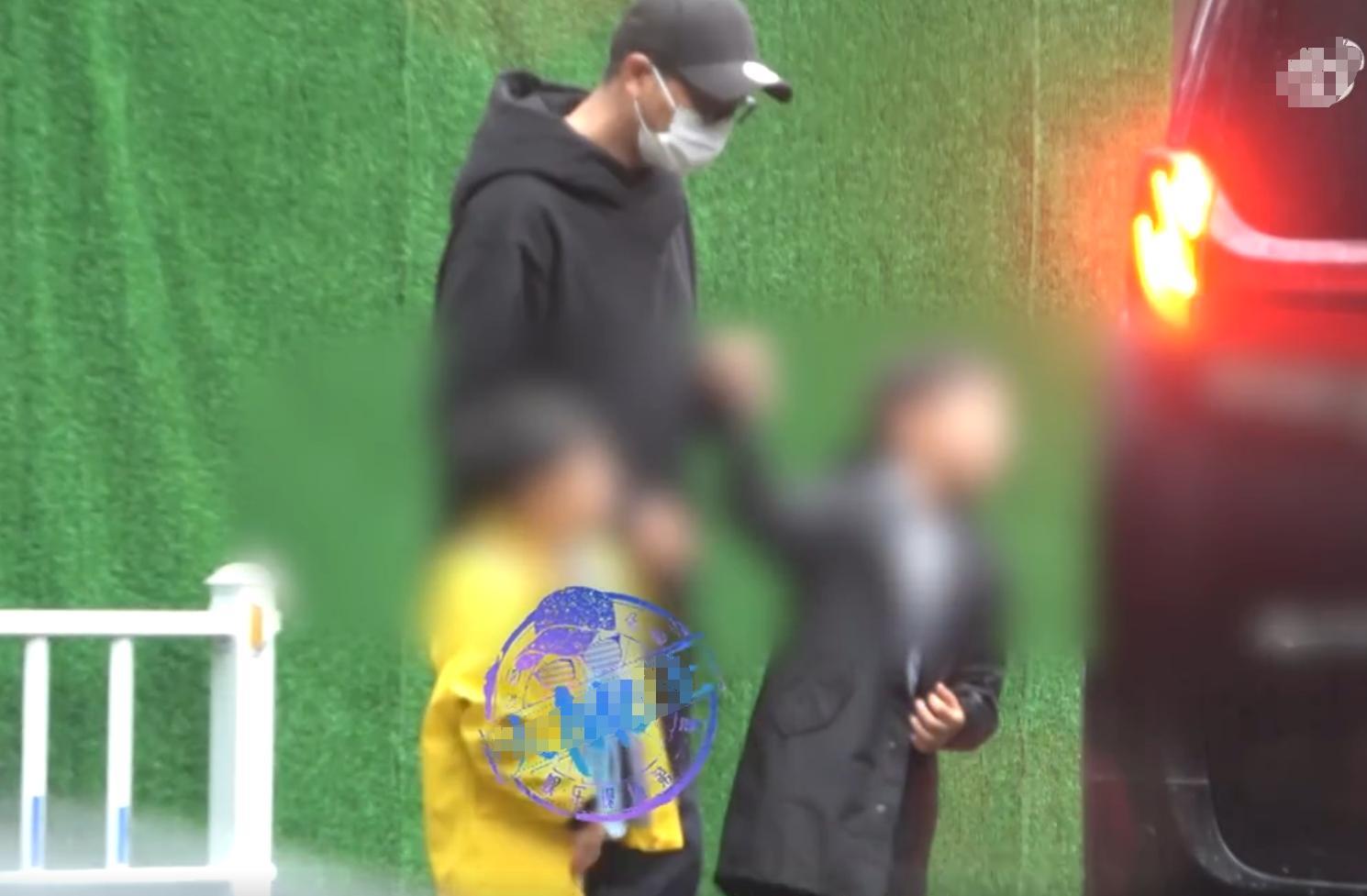 從視頻中可以看到,陳坤戴着黑色帽子和白色口罩,一手牽一個小男孩。