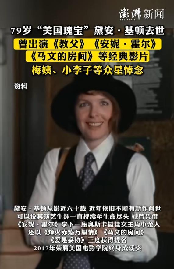 戴安·基頓一生佳作很多,在《教父》《安妮·霍爾》之外,還有《馬文的房間》《烽火赤焰萬里情》《亡命之戀》《曼哈頓神祕謀殺案》《愛是妥協》等電影。