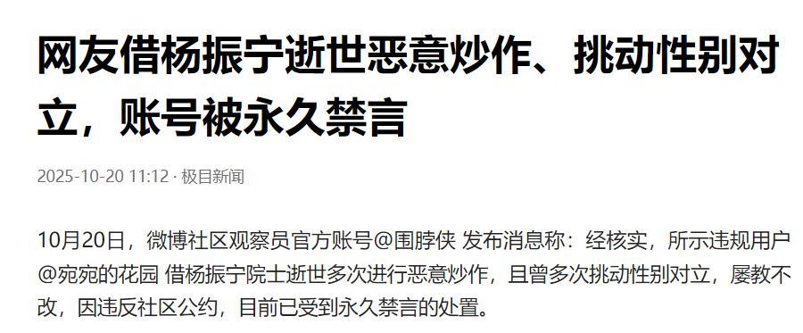 根據微博的通報可知,“宛宛的花園”因爲借楊振寧院士逝世多次進行惡意炒作,且曾多次挑動性別對立,屢教不改,違反社區公約,目前已受到永久禁言的處置。