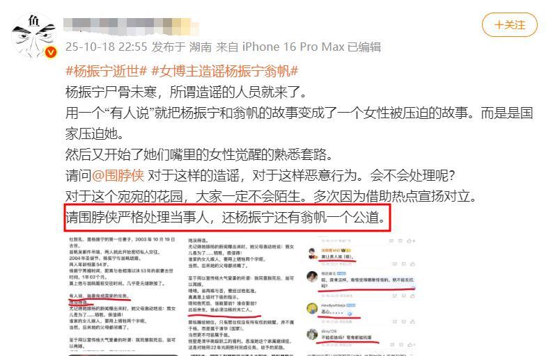 於是有網友發文艾特了微博官方,希望微博官方嚴肅處理此事,還楊振寧和翁帆一個公道。