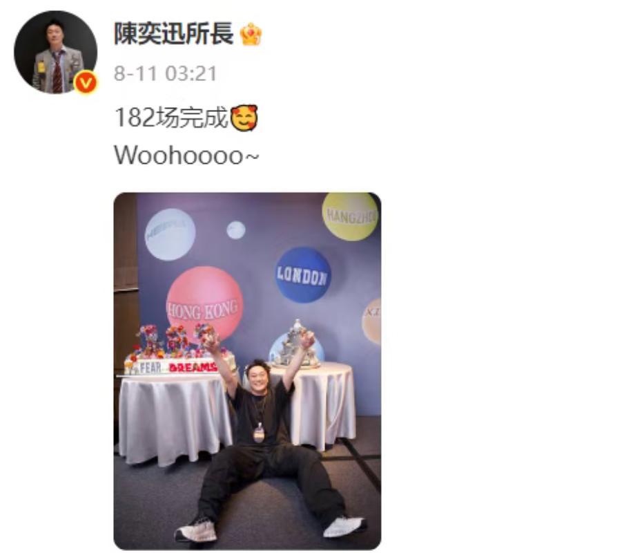 截止到今年8月,陳奕迅的巡迴演唱會,已開滿182場。