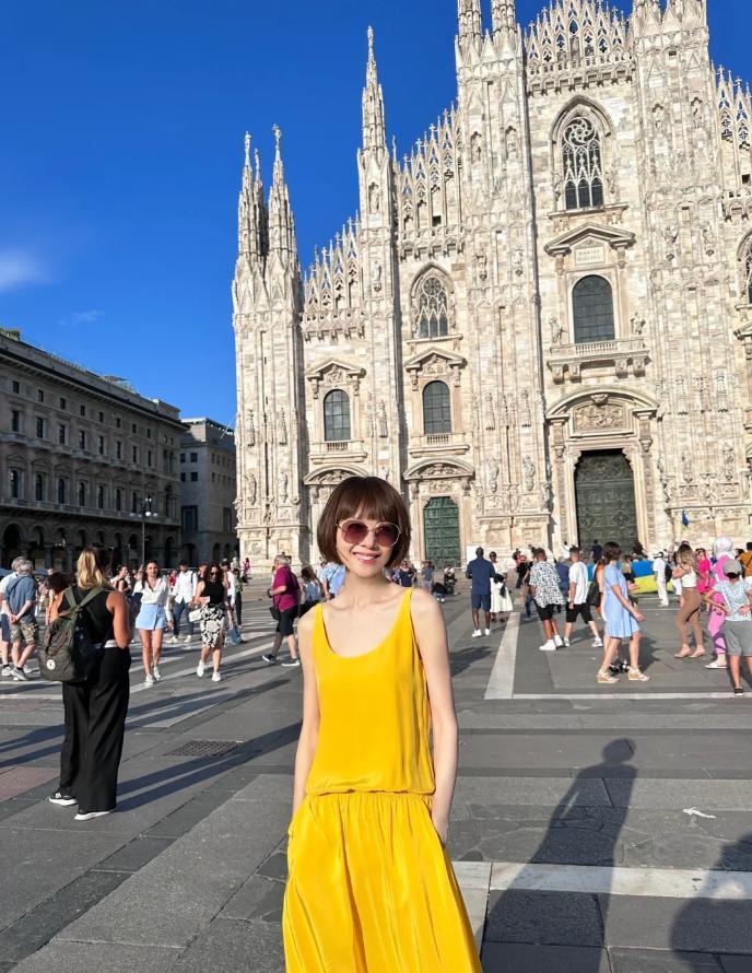 她留着可愛的波波頭,穿粉色吊帶裙時,圓潤的臉頰上掛着鬆弛的笑容,眼角的細紋清晰可見,卻一點也不突兀。