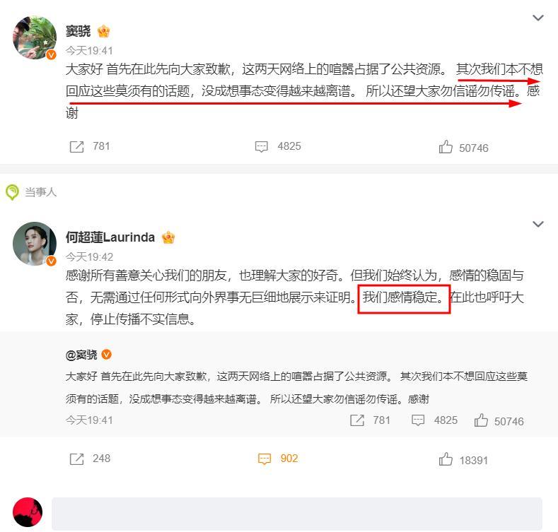 如今,在婚變傳言的走向越來越離譜的時候,竇驍和何超蓮不忍了,一起下場回應了。