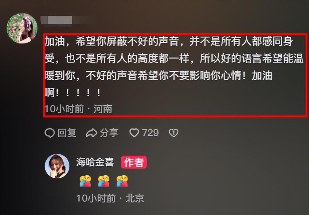 有網友怕海哈金喜看到這樣惡意滿滿的留言會傷心,特意留言安慰海哈金喜。海哈金喜用擁抱的表情回覆了關心她的網友,表達了感謝。