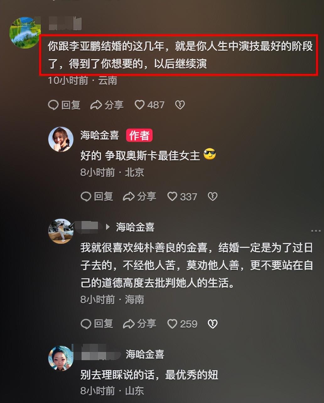 有網友說海哈金喜和李亞鵬在一起的幾年,是她人生中演技最好的階段,說她得到了她想要的,讓她以後繼續演。