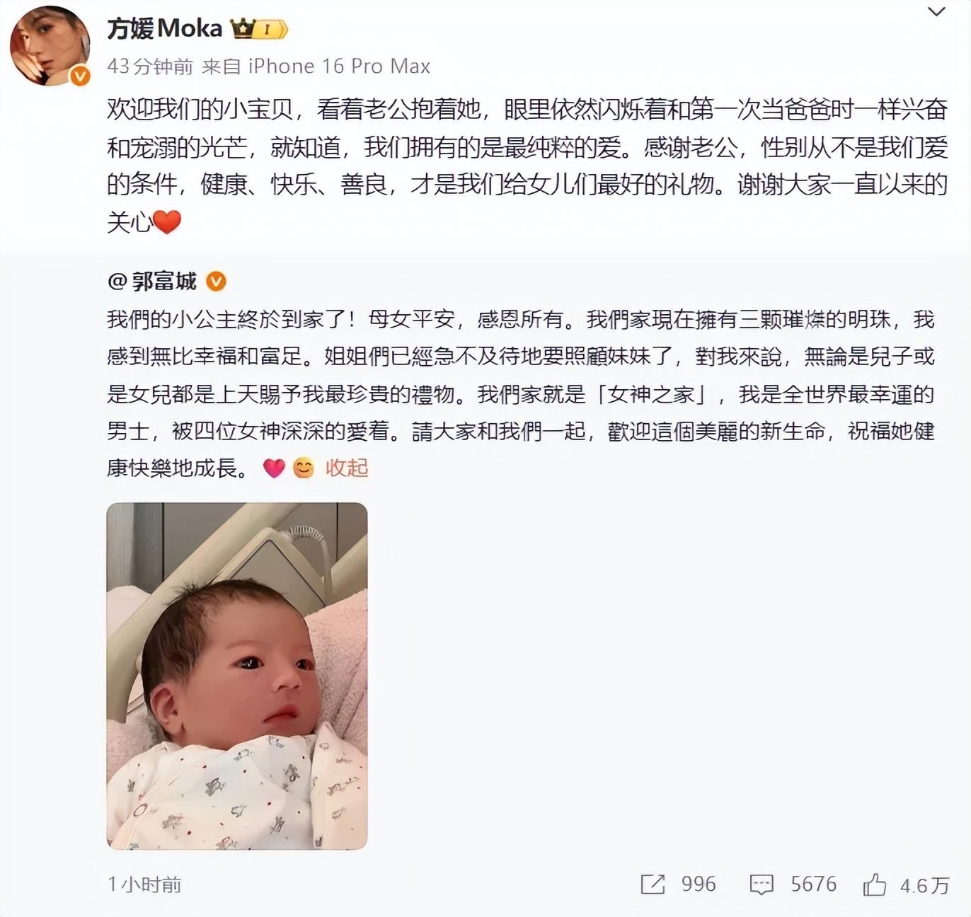 “恭喜郭天王!又多了個疼你的小寶貝”“方媛姐的育兒觀太讚了,健康快樂比什麼都重要”……