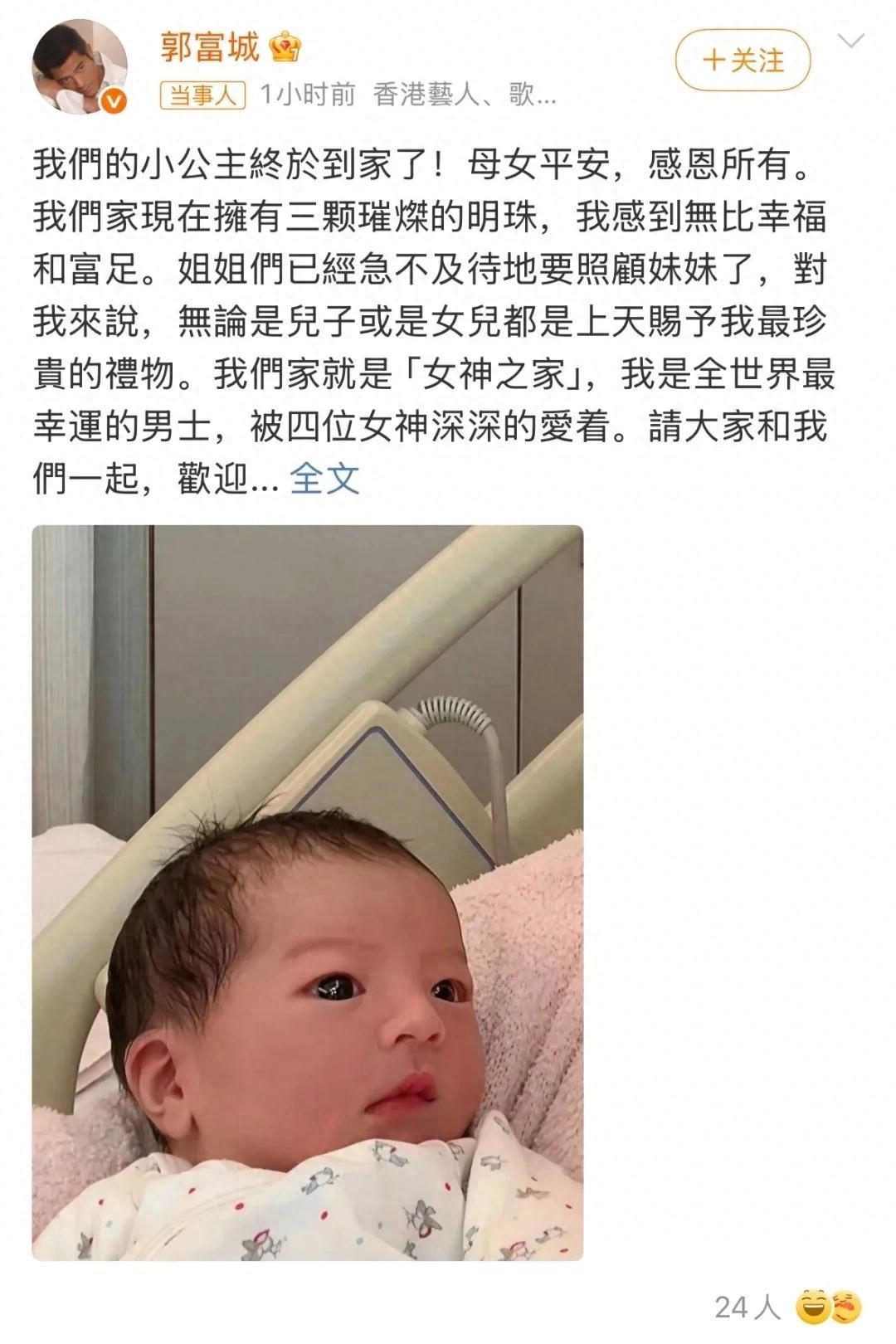 10月22號這天,郭富城親自發文報喜,家裏的第三個小公主順利出生了!他的文案裏滿是藏不住的寵溺,直言自己是 “全世界最幸運的男士”,身邊有四位女神把他放在心尖上疼。