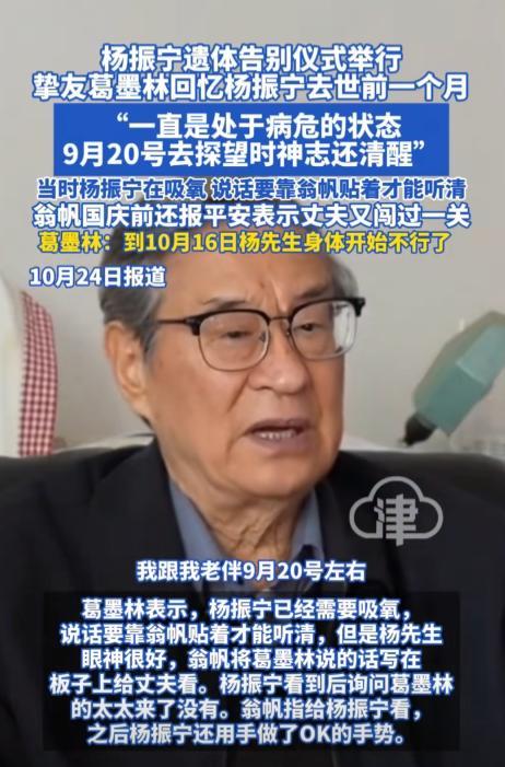 葛墨林透露在去世前一個多月裏,楊振寧先生一直處於病危狀態。