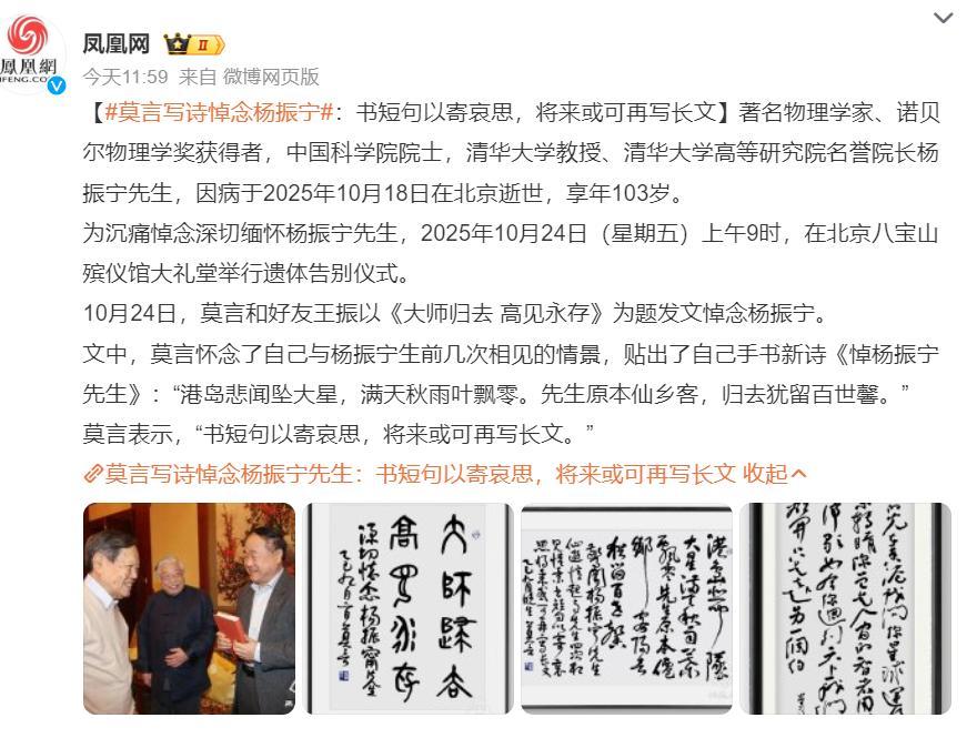在文中,莫言寫了他與楊振寧生前四次相見的情景,並貼出了自己悼念楊振寧的新詩《悼楊振寧先生》。