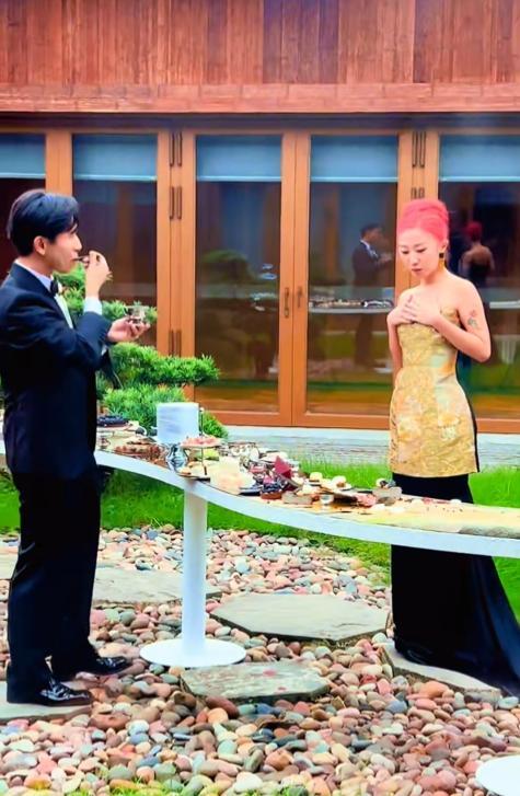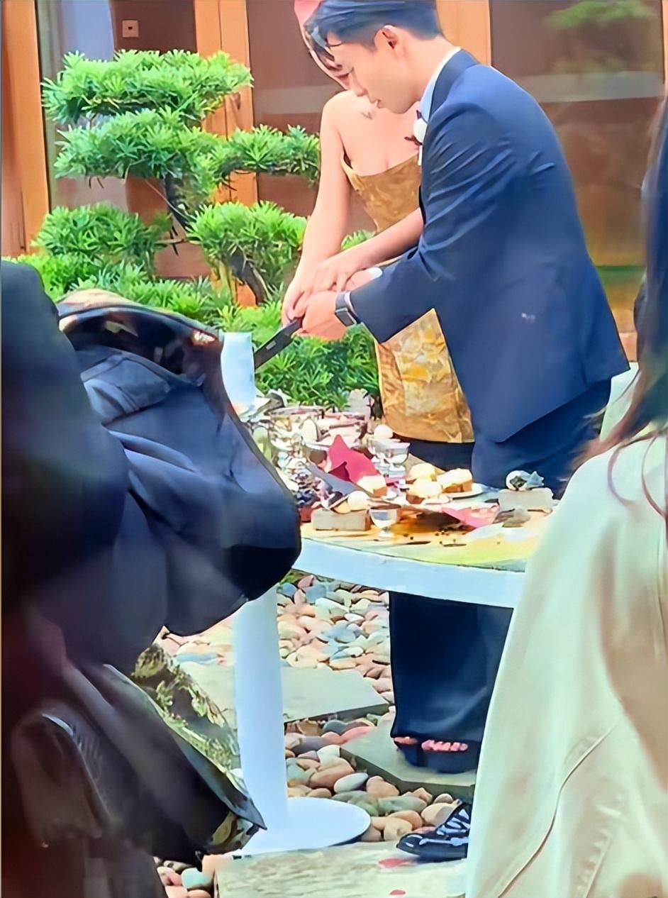 等婚禮儀式結束後,可以看到劉一絲換了一身金色禮服,和新郎一起開心的切蛋糕。