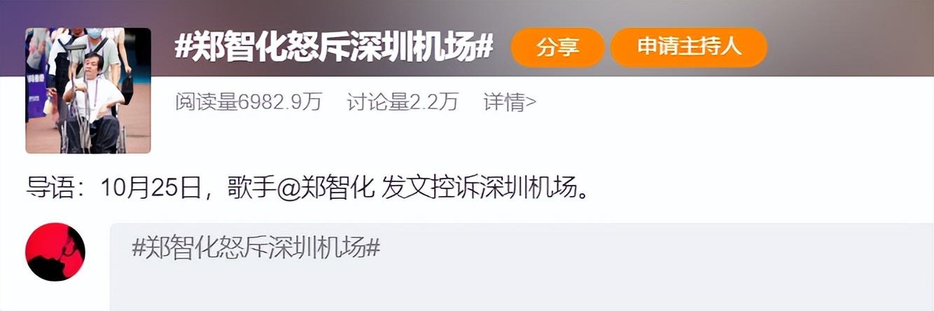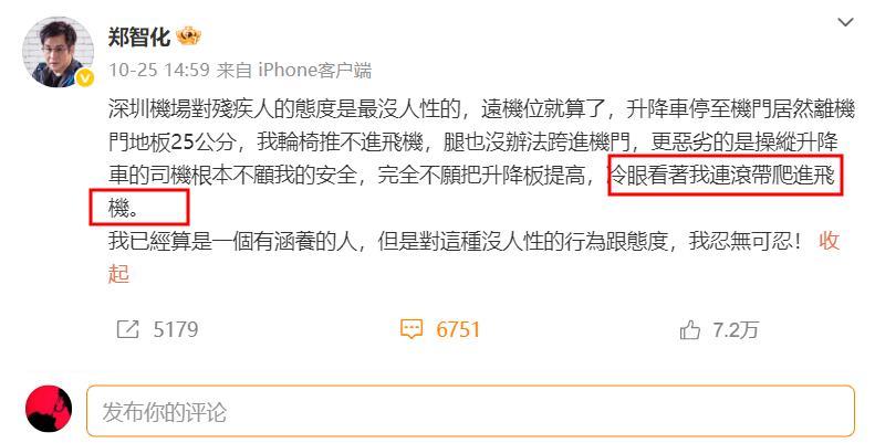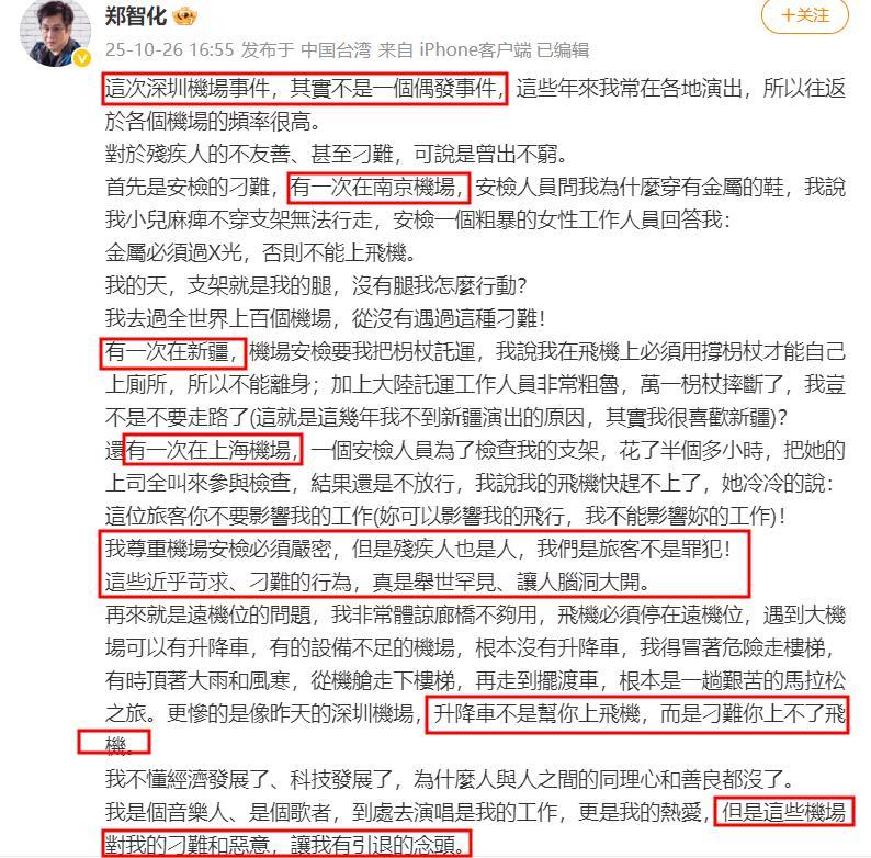 10月25日,鄭智化在社交賬號上突然發文怒斥深圳機場對待殘疾人沒有人性。