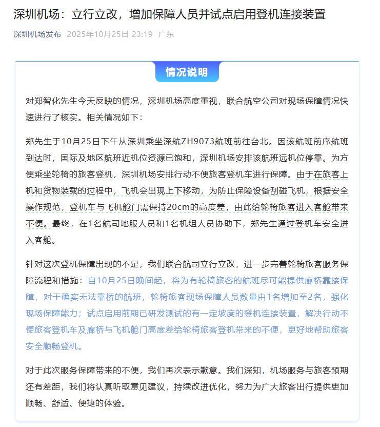 面對輿論,深圳機場也沒有沉默應對,反而是第一時間給鄭智化留言道歉,隨後在當天晚上就發佈了針對此事的情況說明。