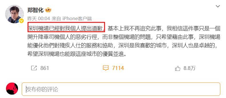 在深圳機場發佈情況說明之後,鄭智化也再次發文了。