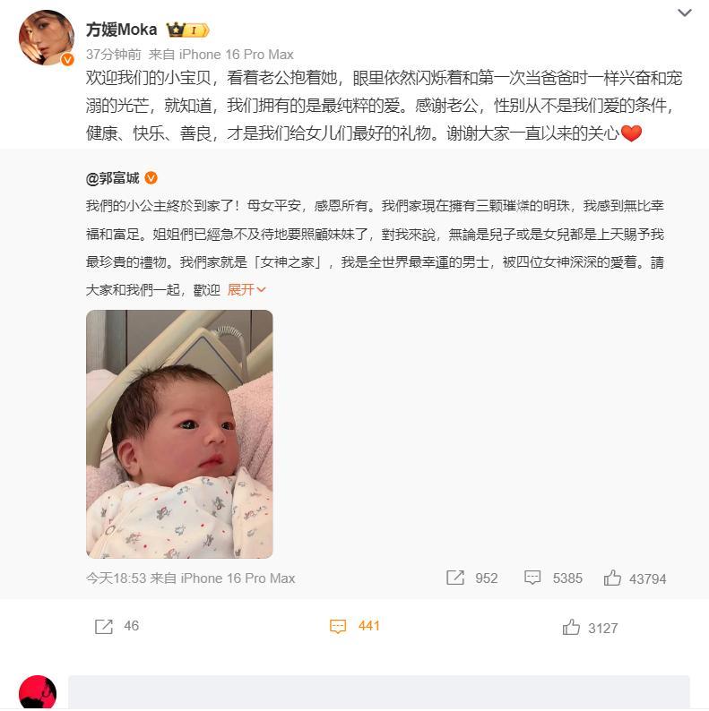 他和方媛的三胎出生了,是一個女孩。
