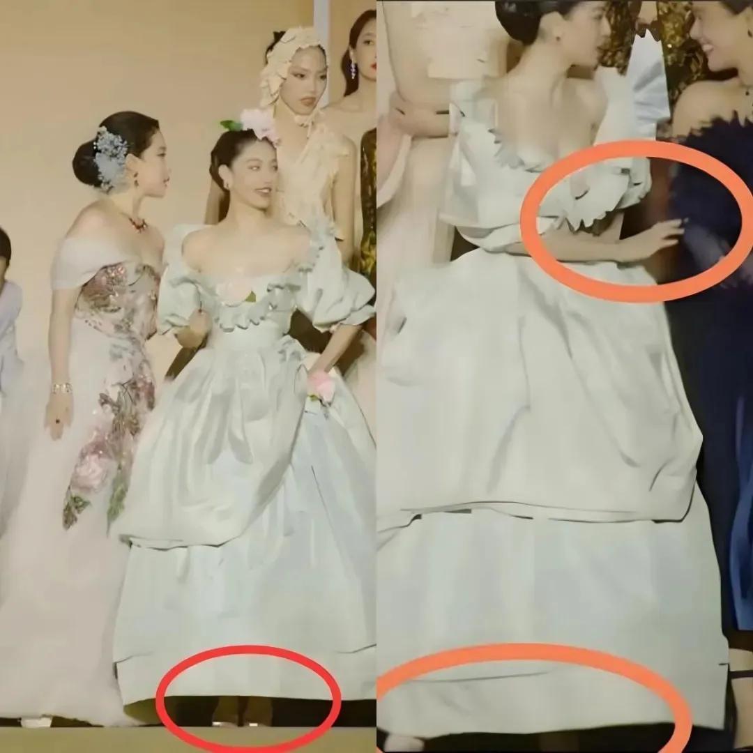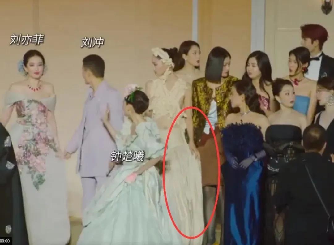 最中間的鐘楚曦確實伸手做了個邀請並打招呼的動作,可仔細觀察就會發現,她只是輕輕提了提裙子,腳壓根沒往前挪半步。
