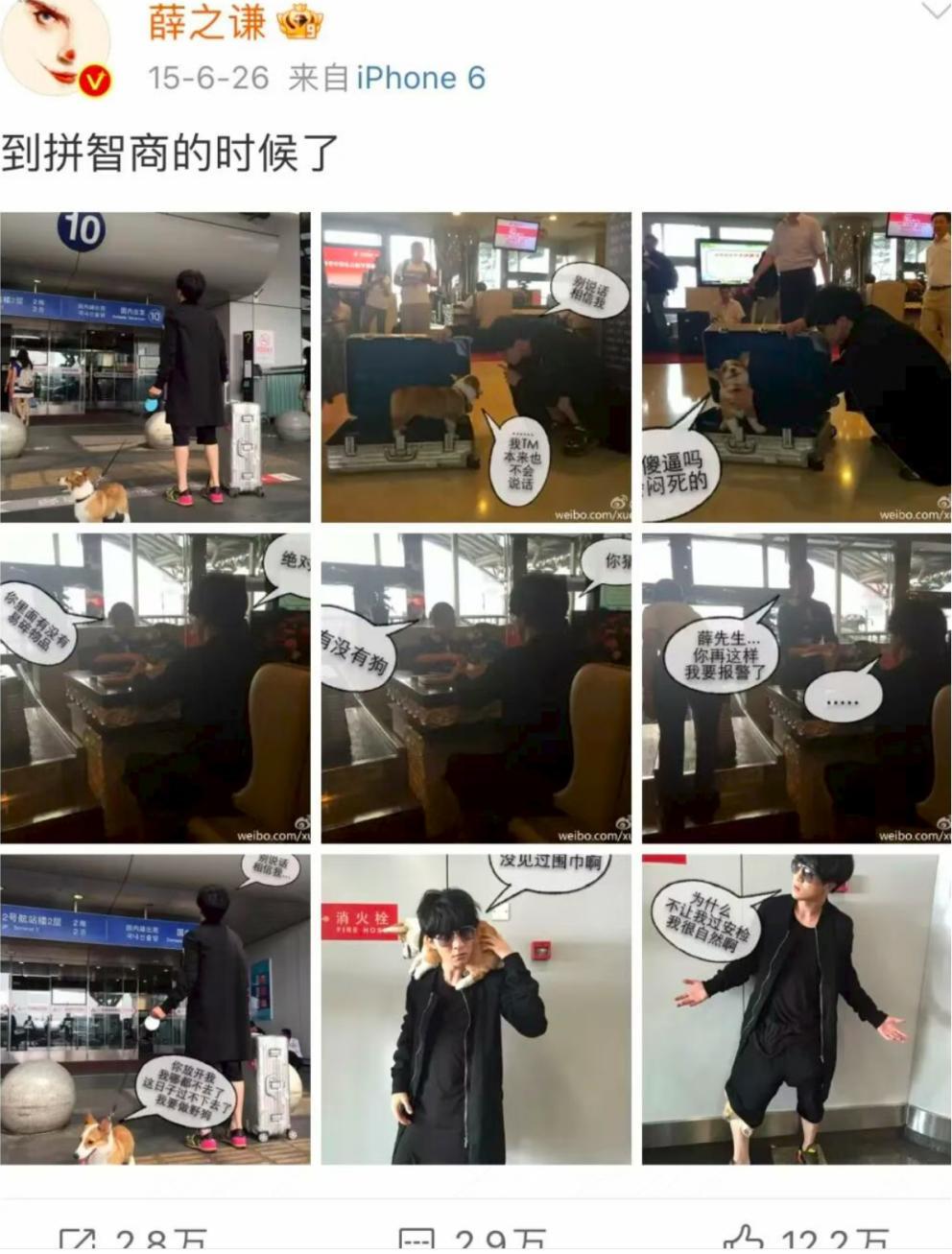 直到2015年,他發的一條帶狗過安檢的微博火爆網絡,搞笑屬性盡顯。
