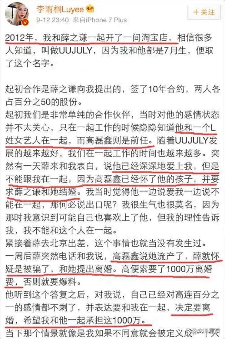 2017年9月12日,李雨桐用4篇文章、20張圖片、1條當事人錄音,爆出了薛之謙的渣男屬性。