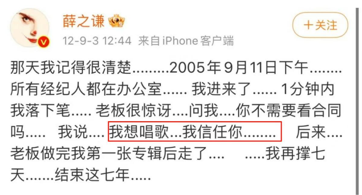 2012年9月,薛之謙發了一條微博,宣佈和上騰娛樂7年合約到期,正式解約。