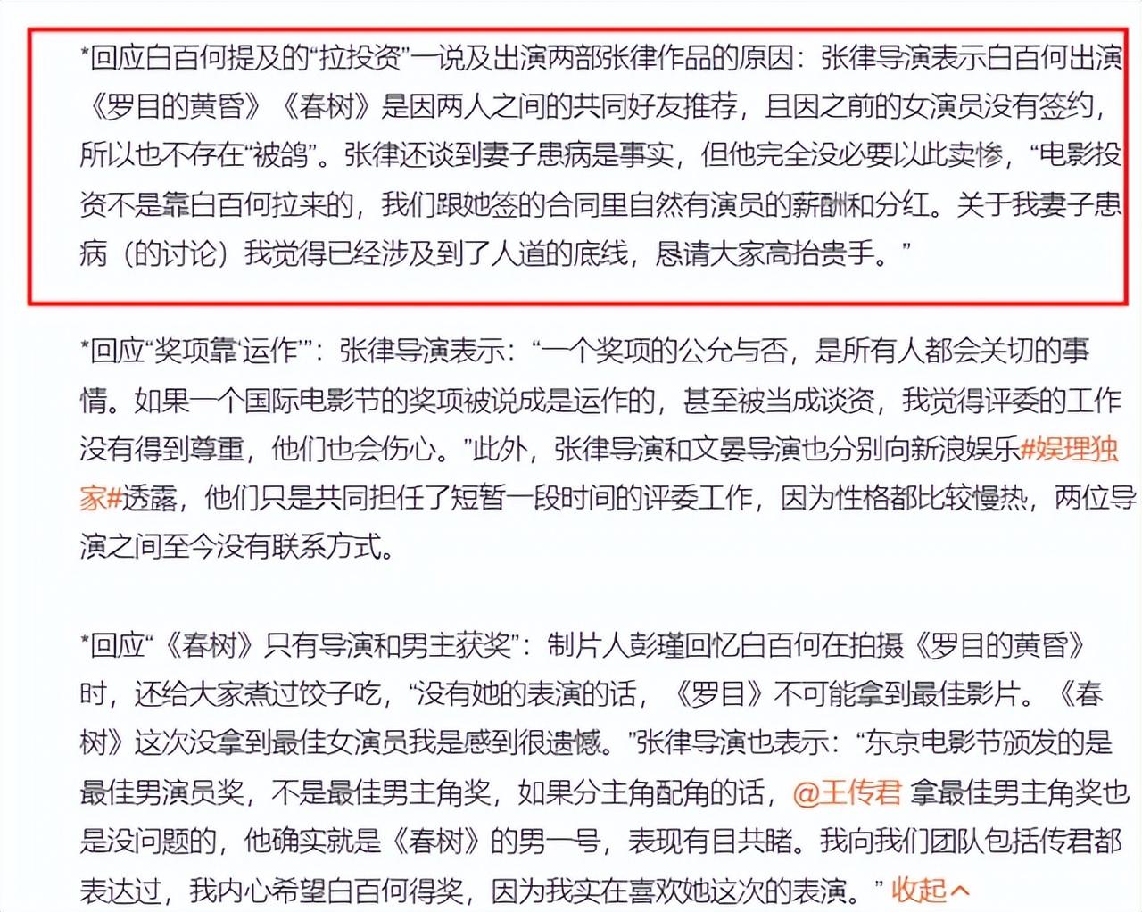 當時網友認爲白百何是在內涵與她合作《春樹》的王傳君,有人爆料稱王傳君是靠滬圈資本的運作才獲得東京電影節影帝。