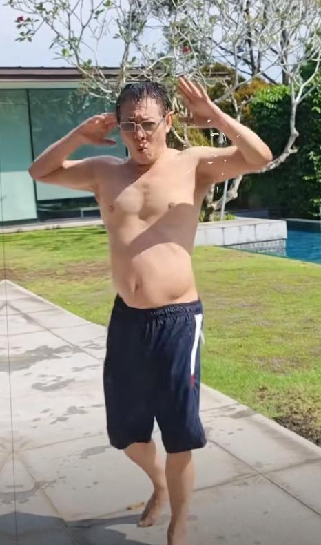 在下游泳池之前,他特意讓鏡頭對準自己的上半身。