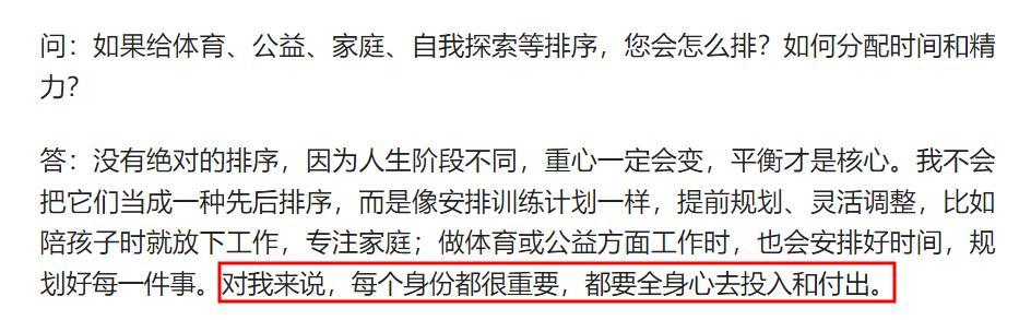 在接受媒體採訪時,她坦言“對我來說,每個身份都很重要,都要全身心去投入和付出。”