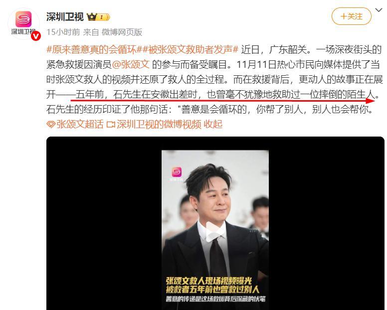原本這件事情沒有人知道,但出事男子得到救助後,他覺得這樣的善意需要傳遞下去,於是發視頻感謝了張頌文,而媒體也注意到了此事,進行了報道。