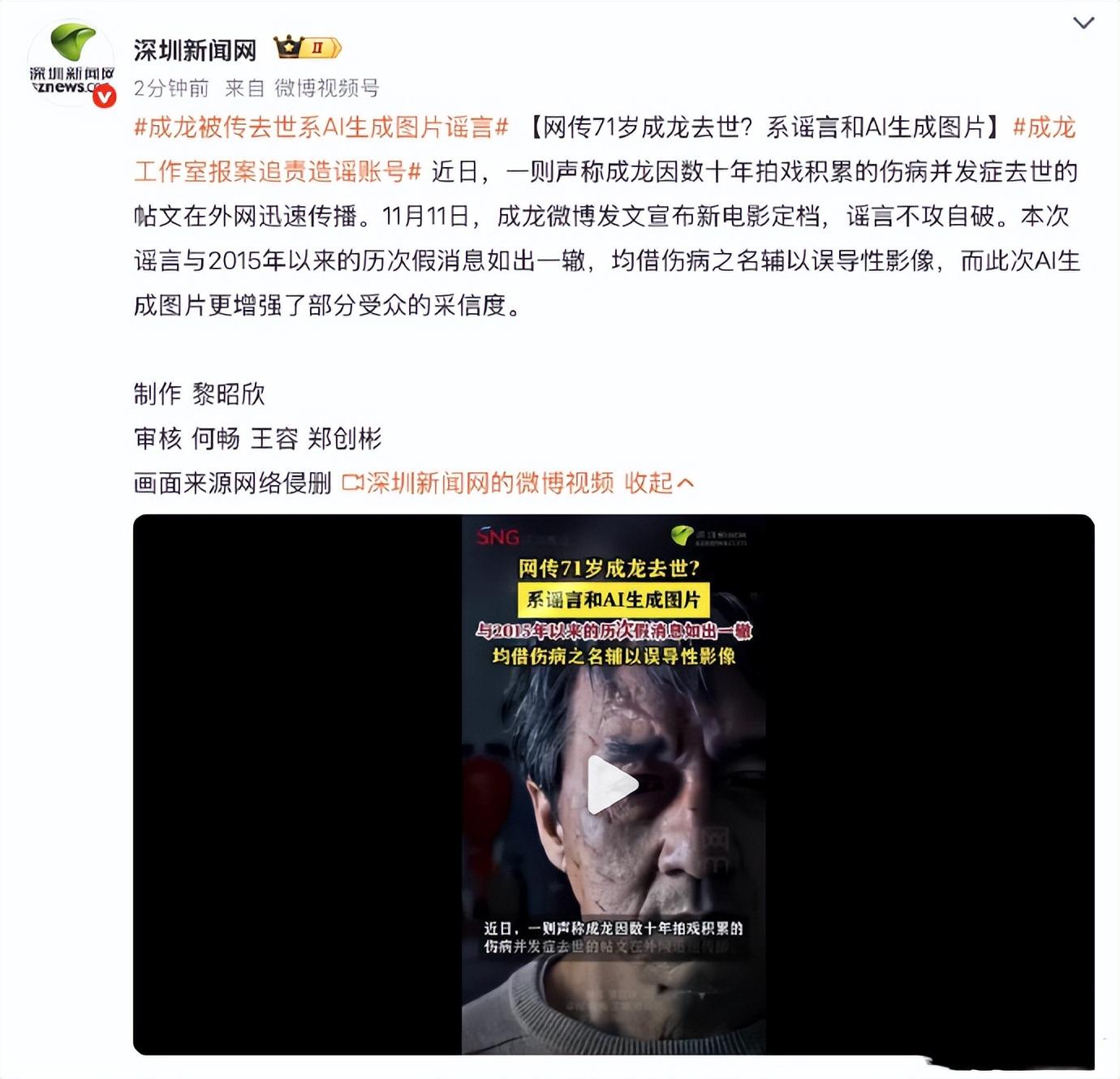 值得一提的是,目前不少網友和媒體已經發現這次關於成龍去世的謠言是AI生成的。而AI生成的成龍病牀照,以假亂真,讓不少網友相信了。