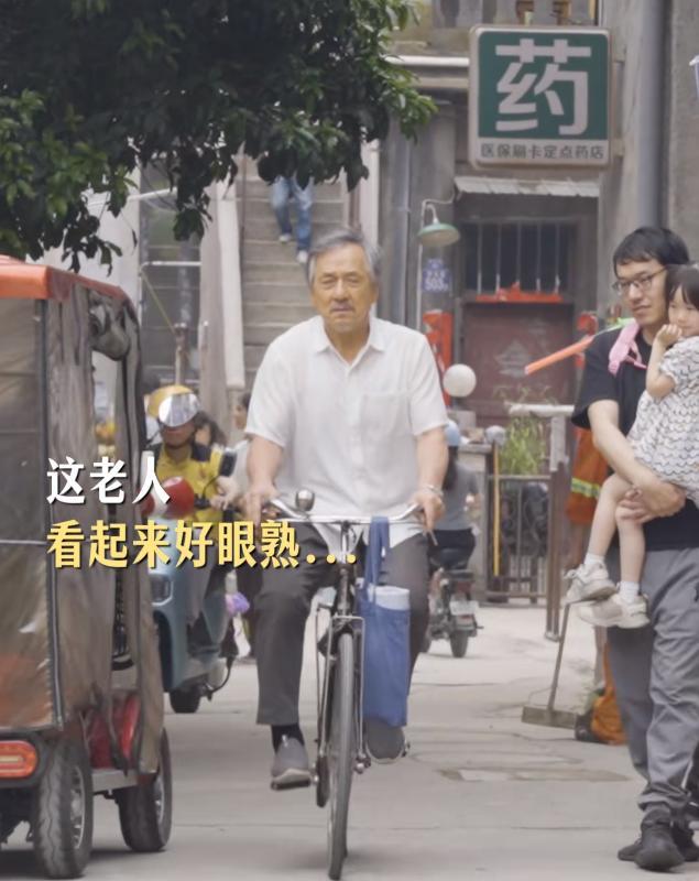 視頻中的成龍滿頭白髮,騎着自行車,很是蒼老。