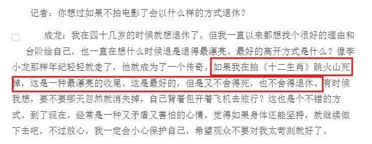 他還說如果在拍《十二生肖》跳火山死掉,這會是一種最漂亮的收尾,但是他又不捨得死,也不捨得退休。因此只要身體還能堅持,他就會繼續做下去,就是希望觀衆不要對他太苛刻。