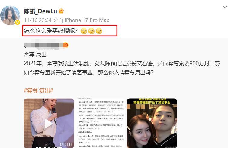 在霍尊復出詞條登上熱搜之後,她還吐槽他愛買熱搜。