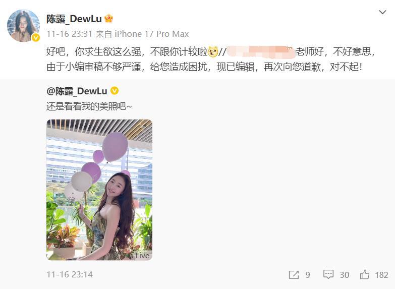 在霍尊復出之後,有一位博主發文說陳露在坐牢,陳露直接在評論區留言。嚇得該博主連忙重新編輯稿件,並向陳露道歉。