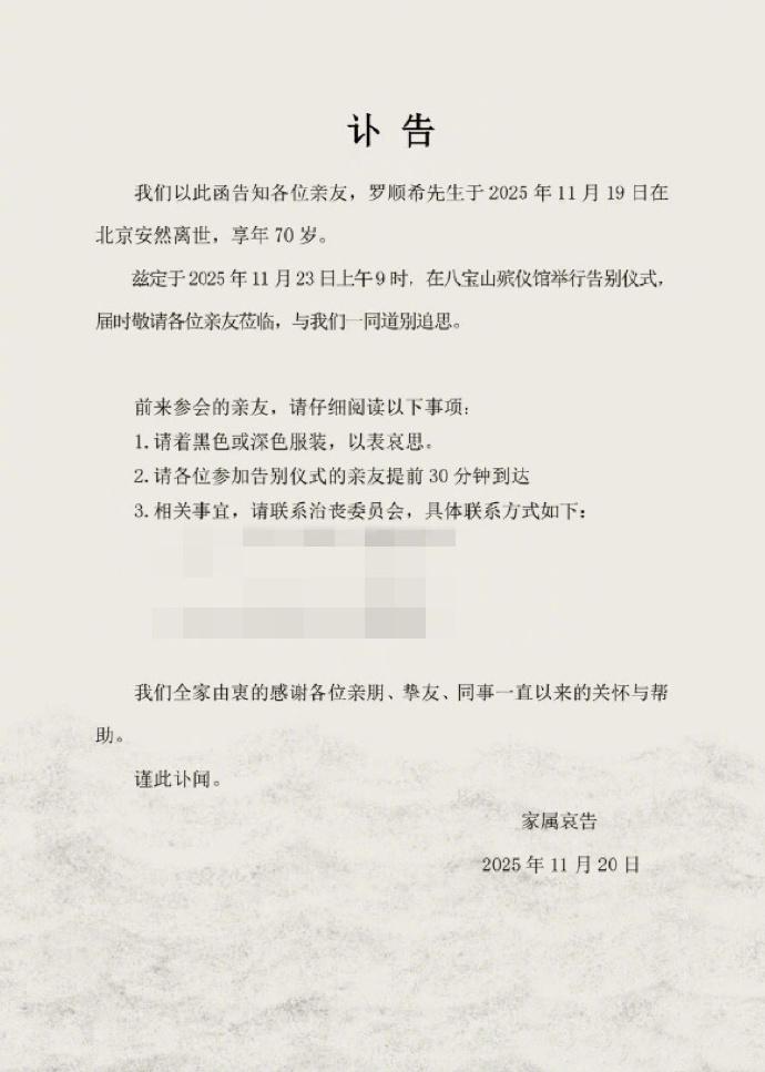 根據訃告可知,羅晉父親在北京離世,享年70歲,將於11月23日在八寶山殯儀館舉行告別儀式。