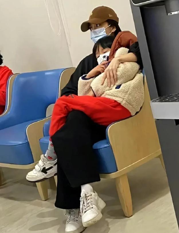 孩子生病了,她陪着去急診,爲了能讓孩子舒服一點,翹着腿讓孩子窩在自己身上。