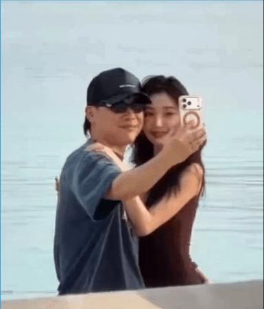 視頻中胡彥斌和一名年輕的美女在海邊接吻。