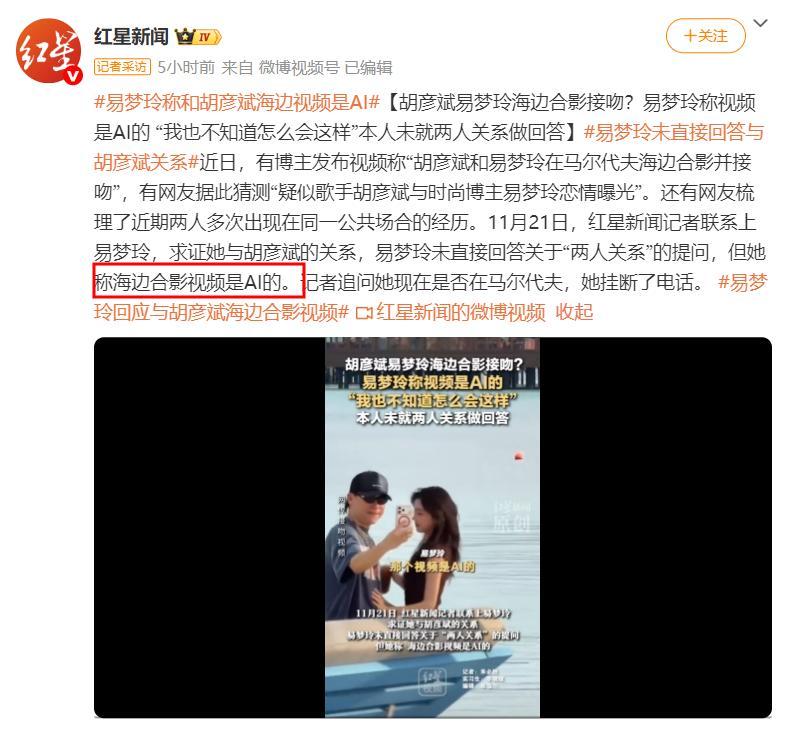 爆料網友說紅星新聞不知道怎麼弄到了易夢玲的電話,電話打過去就劈頭蓋臉的詢問,易夢玲以爲是私生,就隨便胡說八道應付了一下,結果紅星新聞把易夢玲的話剪了一下,就有了易夢玲說海邊視頻是AI的熱搜。